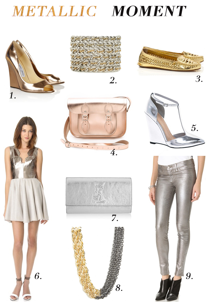 1. Leather Wedge Pumps // 2. Silver Link Cuff // 3. Gold Moccasins // 4. Cambridge Satchel // 5. ASOS “Pivotal” Wedges // 6. Silver Bodice Dress // 7. Belle de Jour Clutch // 8. Chain Collar // 9. Super Skinny Jeans